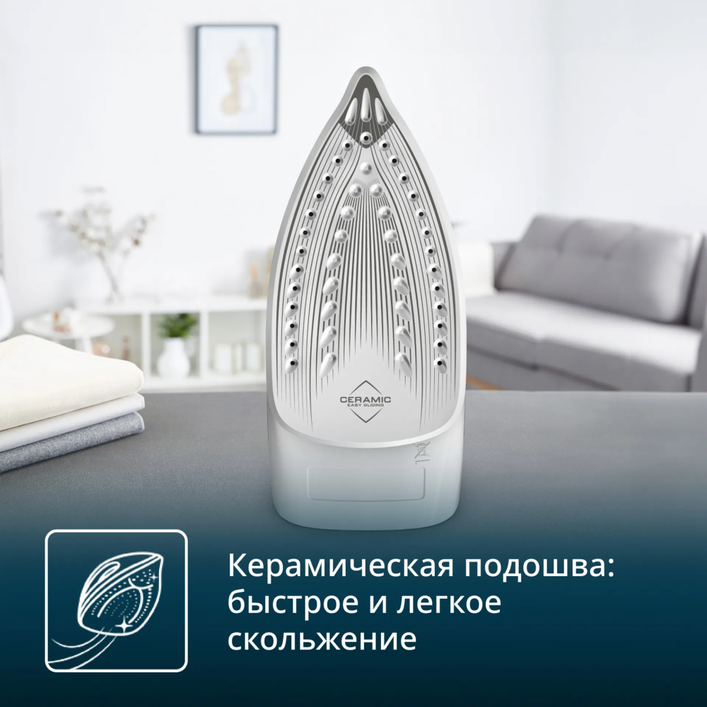 - Керамическое покрытие подошвы предотвращает прилипание текстиля, обеспечивает лёгкое скольжение и равномерное распределение тепла.