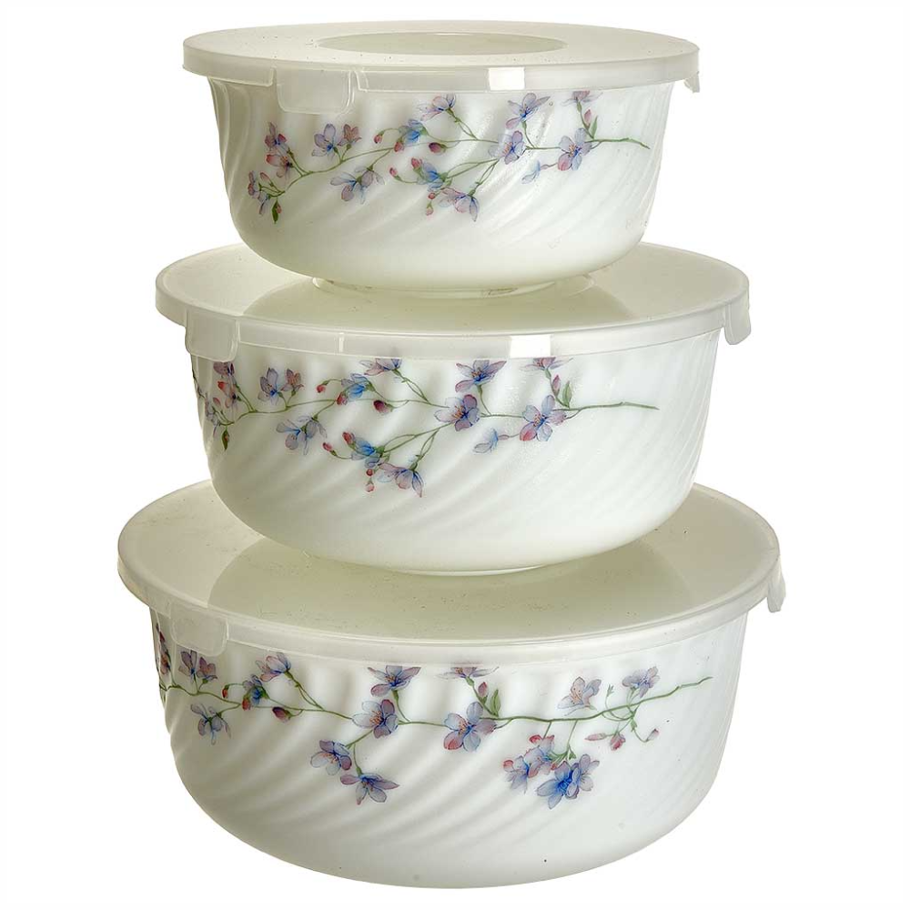 - Набор из 3-х салатников разного объема из термостойкой стеклокерамики с пластмассовыми крышками