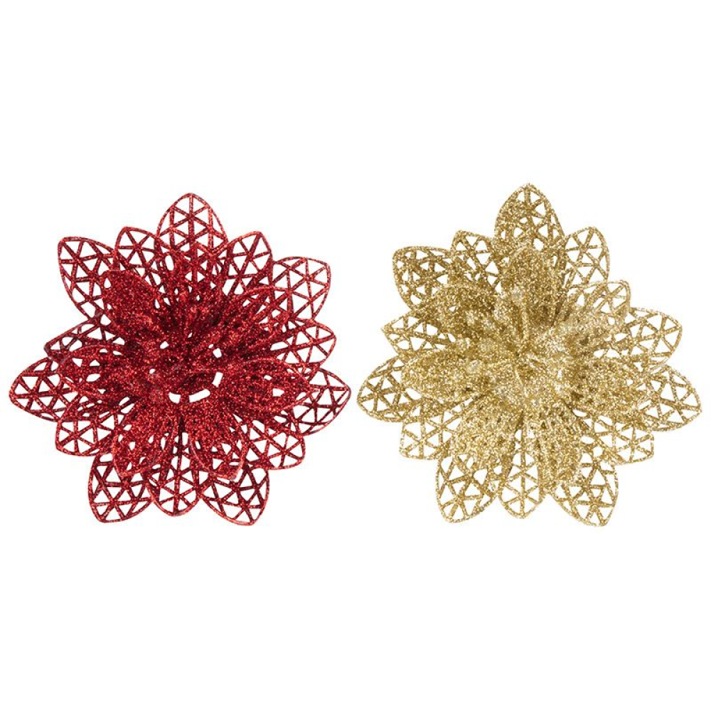 Украшение декоративное "Цветок" (2шт) Материал: пластмасса, металл Размер: 10.5см Цвет: красный, золотой Крепление на клипсе Упаковка: пакет с подвесом