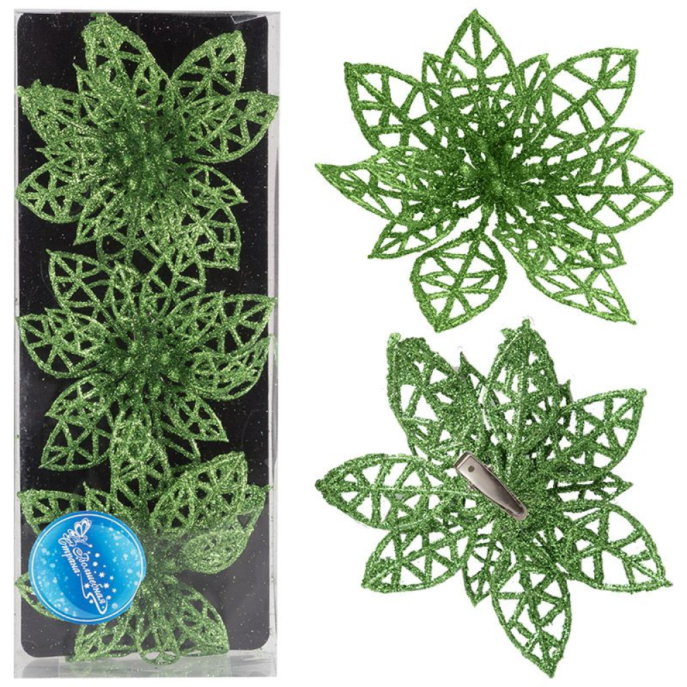Украшение "Цветок" (3шт) материал: пластмасса, металл размер: 10см цвет: зеленый крепление: зажим (клипса) упаковка: картонная коробка с ПВХ экраном