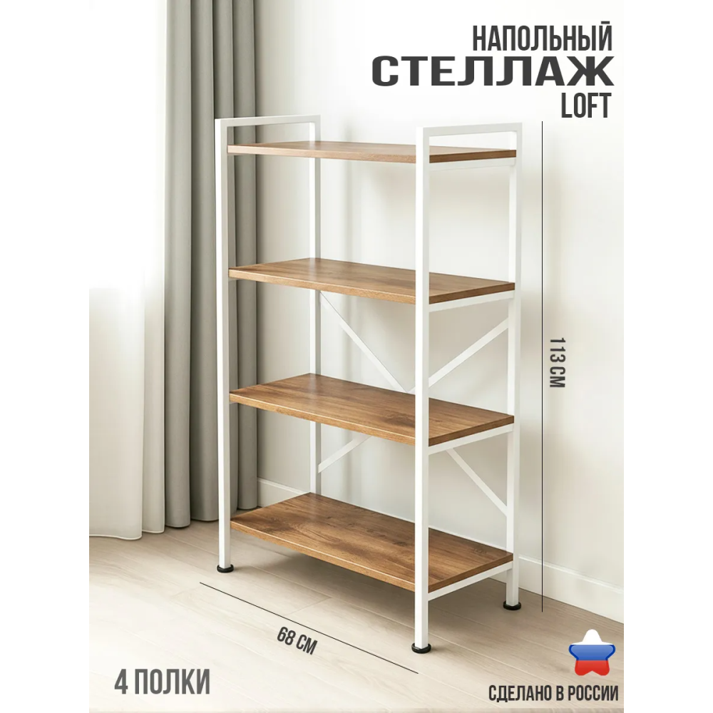 Открытый напольный стеллаж с деревянными полками, выполненными из ламинированного ДСП коричневого цвета с текстурой «Дуб вотан», отличается высокой надежностью благодаря белому глянцевому каркасу, изготовленному из усиленного металлического профиля 20x20 мм, что делает изделие прочным и практичным. Благодаря высокой надежности и устойчивости металлокаркаса, каждая полка выдержит нагрузку до 35 кг. Четыре яруса выдержат общий вес до 140 кг.