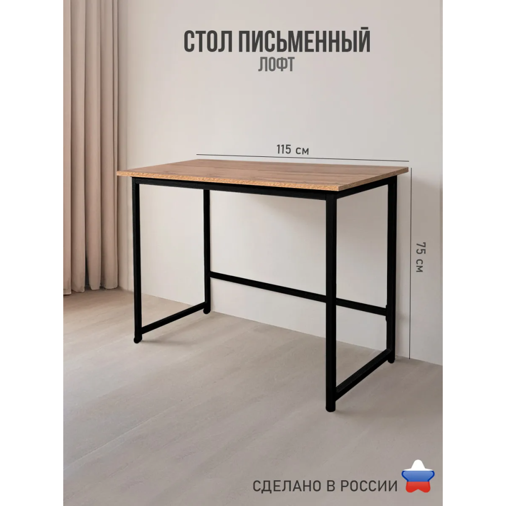 Столешница 115х60 см выполнена из ламинированного ДСП (ЛДСП) в коричневом цвете «Дуб вотан». Этот материал делает поверхность долговечным и не требует особого ухода. Ножки оснащены специальными заглушками, которые предотвращают появление царапин на напольном покрытии и полу, а так же регулируются по высоте.